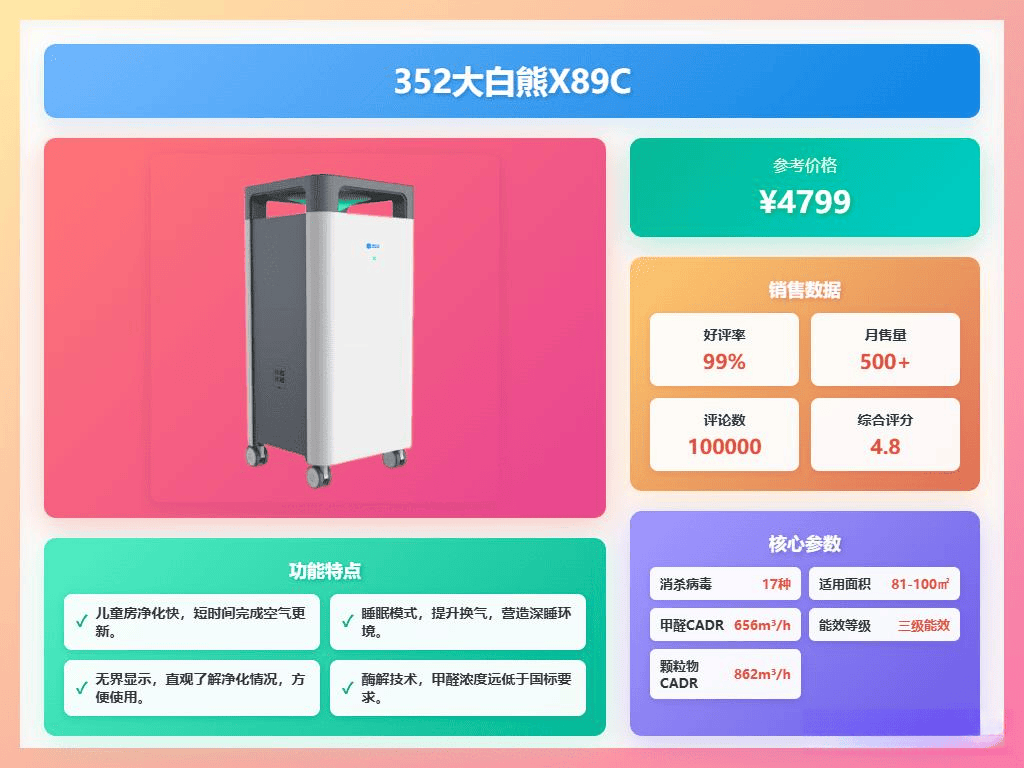 而352则专注于空气净化领域,在滤网技术、除醛效果等方面更加专业,用料扎实,净化效果更明显,适合对空气质量有更加高的要求,或者有孕妇、宝宝等特殊人群的家庭。像大白熊X89C、Z90、Y106、X88、Z120等型号,都体现了其在专业净化方面的优势。